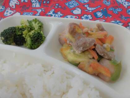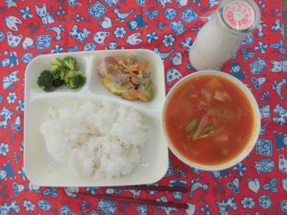 献立は、鶏肉とチーズのカラフル焼き、野菜のミネストローネ、ブロッコリーのサラダ、ごはん、牛乳でした。