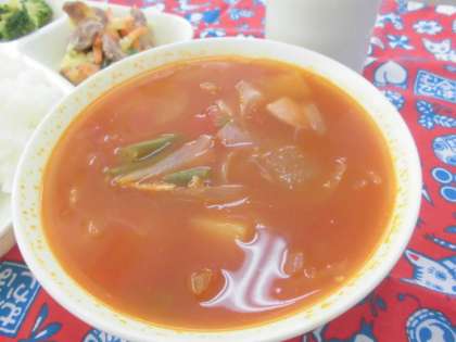 鶏肉とチーズのカラフル焼きは、鶏肉の黄土色、チーズのクリーム色、にんじんのオレンジ色、ピーマンの緑で彩りよく、目で楽しみながら、しっかりとした味も楽しみました。野菜のミネストローネの酸っぱさとうまく合って、とてもおいしくいただきました。