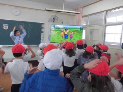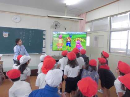 1時間目が体育の2年生は、着替えて1組の教室に集まって英語活動をしていました。