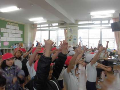 身体の各部位を英語で言いながらダンスのようにリズムを取って手でおさえていきます。