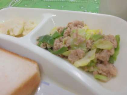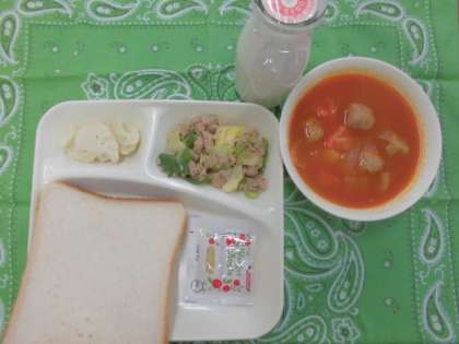 献立は、ミートボールと野菜のケチャップ煮、ツナと野菜のソテー、カリフラワーのレモン風味サラダ、ジャム、パン、牛乳でした。