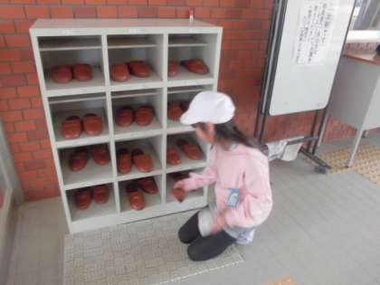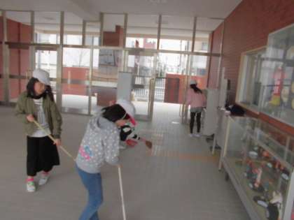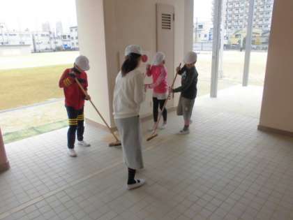 玄関やピロティは、靴底の土が落ちて、運動場が湿っているときなどは、大量の土が残っています。土や砂のほこりが舞い上がったりして大変です。でも、毎日きれいに掃いたり拭いたりしています。