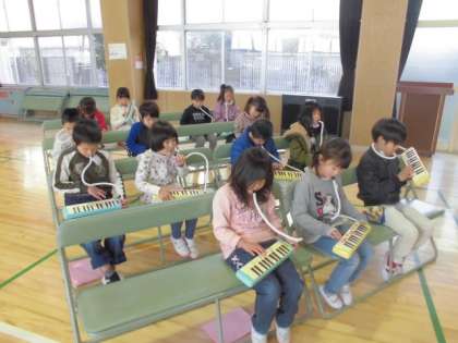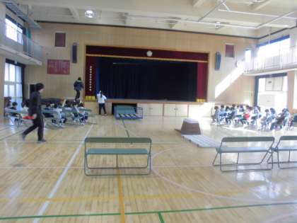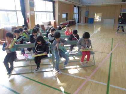 1年生が講堂で、19日の学習参観時に発表する「もうすぐ2ねんせい」の確認や練習をしていました。