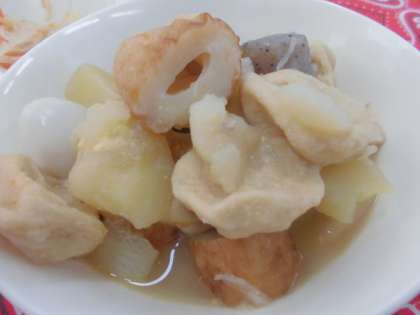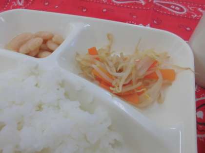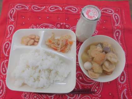 献立は、関東煮、甘酢あえ、大福豆の煮物、ごはん、牛乳でした。