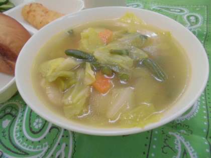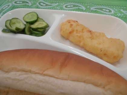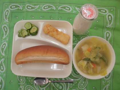 献立は、いかてんぷら、スープ煮、きゅうりのピクルス、パン、牛乳でした。