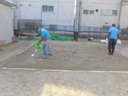 砂場に雨・土が入り固くなっていたこととネコの糞尿の消毒や植物の除去も兼ねての作業です。