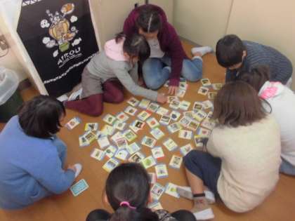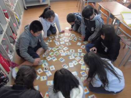 外国語クラブです。今日は、2グループに分かれて英語のカルタをして楽しんでいます。