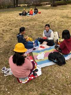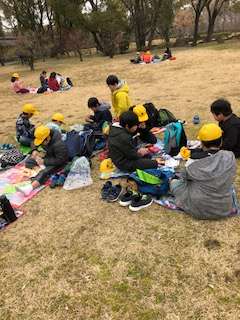 曇り空ですが、風がほとんどないので寒さは感じません。みんな落ち着いてお弁当を食べています。