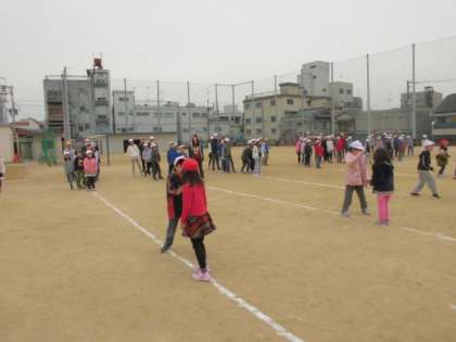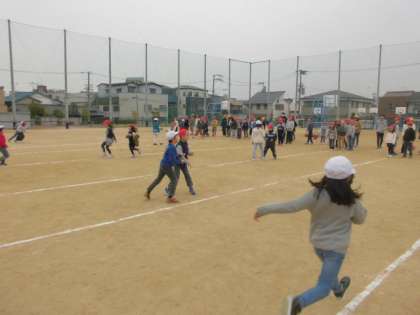 各縦割り班のA班とB班に分かれて向かい合い、ジャンケンをして勝ったら相手の班の陣地に向かっていくというゲームです。
