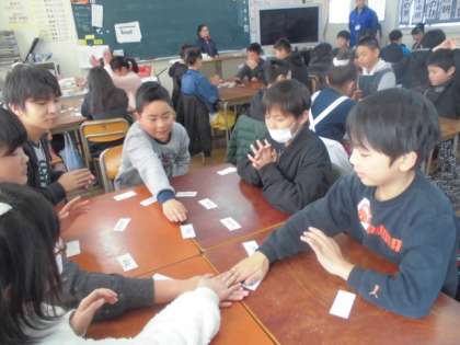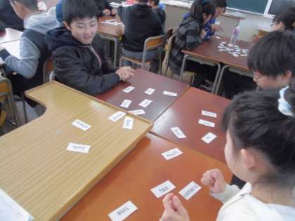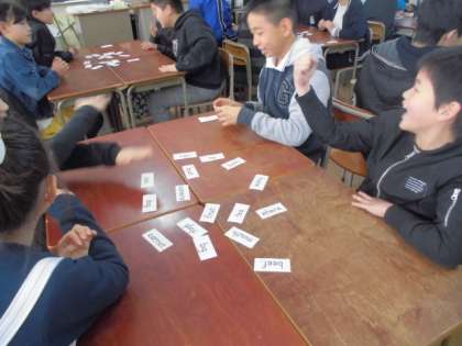 カルタをしながら、英語の単語の発音と意味を学びます。