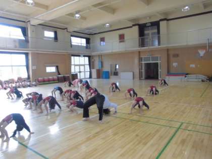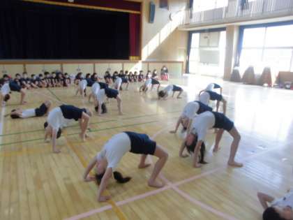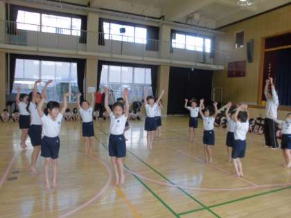 幼児の園の先生にリードしていただきながら、いろいろな動きをピアノの伴奏で行います。幼児の園の園児たちはもちろん、1年生たちも一生懸命に一つ一つの動きにチャレンジしています。