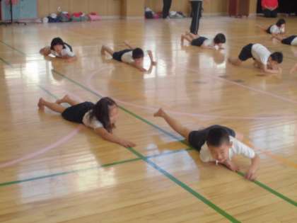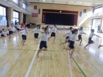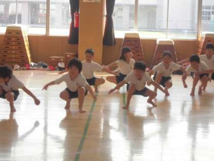幼児の園の園児たちが初めにリズムにのった動きを見て、1年生たちが動きのポイントをそれぞれにつかみながら行っています。
