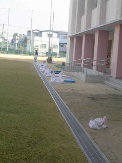 運動場が広いので、側溝もあちらこちらと長く大変な作業です。