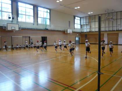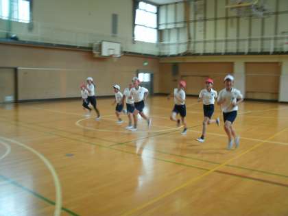 スポーツテストの中の1つに「シャトルラン」があります。20メートル間隔で平行に引かれた2本の線を往復します。一定の時間に線を越えることができなくなると終了します。今年は勝山中学校の体育館をお借りして実施しています。