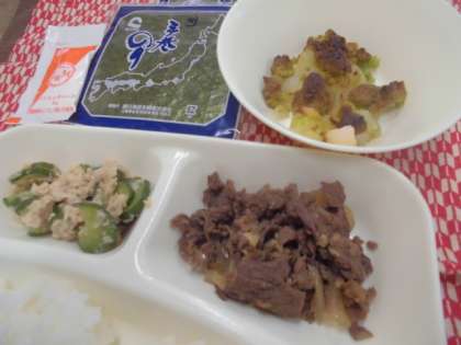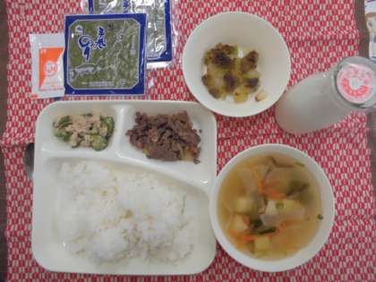 本日の給食は「卒業祝い献立」で、手巻きご飯の具(牛肉の甘辛煮、ツナソテー)、すまし汁、和梨の抹茶クランブル、のり、ごはん、牛乳でした。