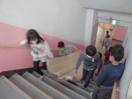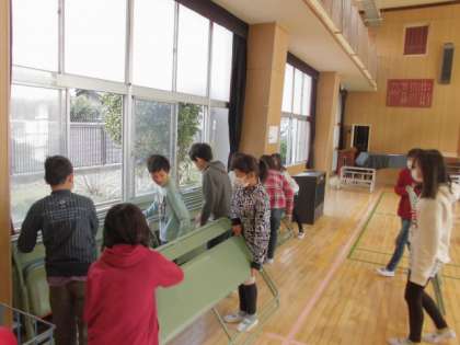 長椅子や個人用パイプ椅子を出し、マット、跳び箱、ボール類をプール棟や講堂棟の2階へ運んだりしました。少ない人数でしたが、声を掛け合い協力してテキパキと活動していました。講堂内がすっきりと美しく整いました。