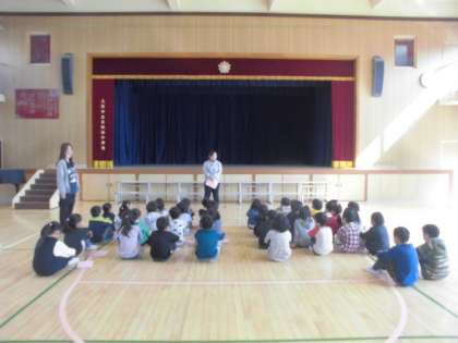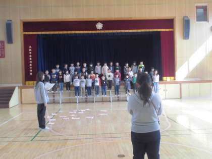 5年生の講堂整理活動と並行して、講堂で1年生が入学式お迎えのことば等を練習していました。
