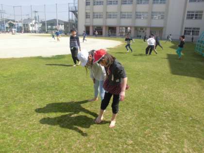 芝生ではだしになって、遊んでいます。