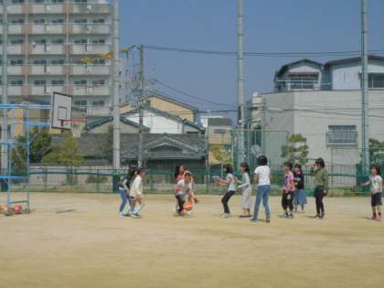 4年生女子がバスケットボールコートで夢中になってボールを追いかけ楽しんでいました。