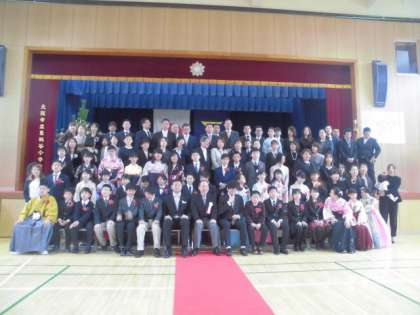 いったん教室へもどった後、講堂で保護者の皆様もはいっての記念写真撮影を行いました。
