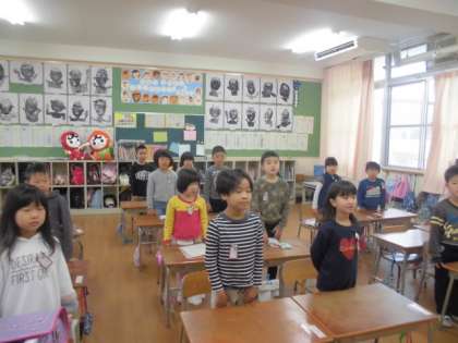 1年1組では、学習タイムが始まるまで日直担当の子どもが前に出て朝の会をしていました。
