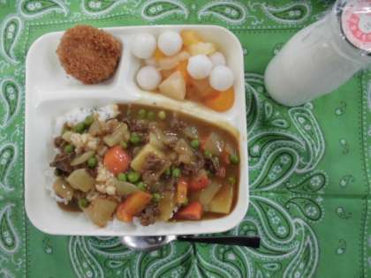 今日は、入学祝い献立です。カツカレーライス、フルーツ白玉、牛乳でした。