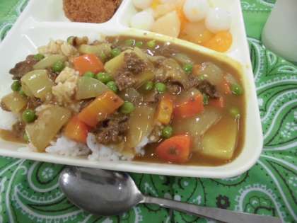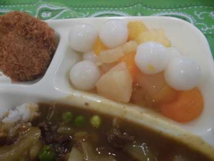 いつものカレーライスにカツが入るととても豪華になります。フルーツ白玉のデザートも子どもたちは大好きです。