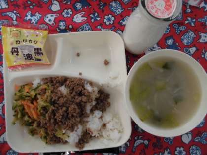 献立は、ビビンバ、トック、いり黒豆、牛乳でした。