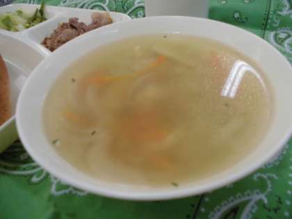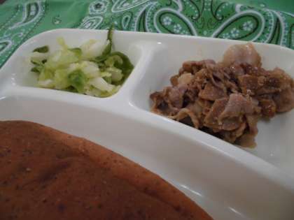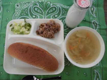 献立は、豚肉のデミグラスソース、スープ、キャベツとピーマンのソテー、パン、牛乳でした。