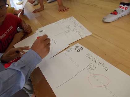 今年度初めての全校児童集会(たてわり班)です。集会委員による「伝言ゲーム」をしました。各班の1年生がはじめに「伝言」を聞きにいきます。そのあと、2年生〜6年生に伝えていきます。最後の6年生が紙に書いて集会委員に見せて合っていれば○を書いてくれます。楽しく仲良く活動していました。