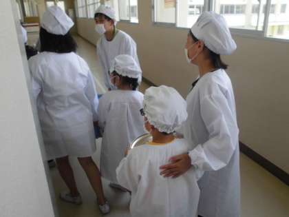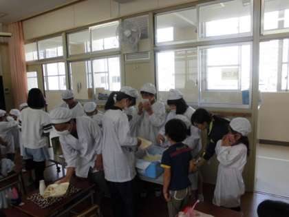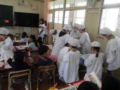 6年生は自分がする方が速く、楽にできるところですが、1年生ができるようにと声掛けしたり、手をそえたりしていました。