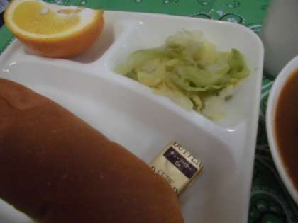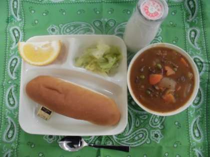 献立は、ビーフシチュー、キャベツのピクルス、甘夏かん、パン、バター、牛乳でした。