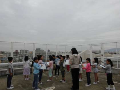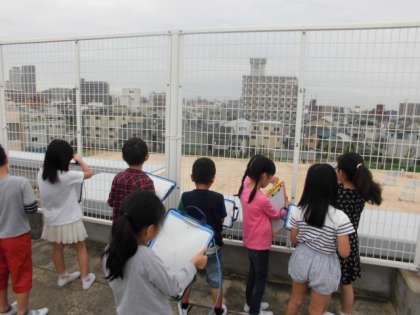 先日の3年1組に続いて、今日は2組が屋上から東桃谷小学校校区を見学しました。