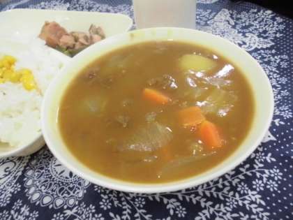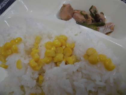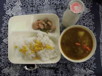 献立は、さけのちゃんちゃん焼き、とうもろこしごはん、スープカレー、牛乳でした。