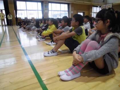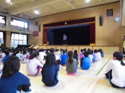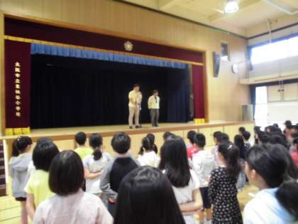 ゴールデンウィーク明けの児童朝会は、雨のために講堂で行いました。