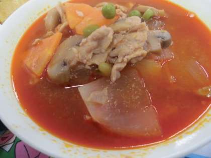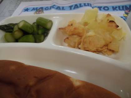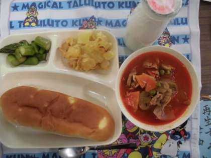 献立は、ケチャップ煮、グリーンアスパラガスのサラダ、りんごのクラフティ、おさつパン、牛乳でした。
