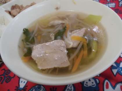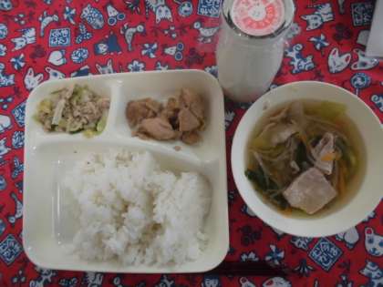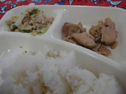 献立は、鶏肉のオイスターソース焼き、中華スープ、ツナと野菜のごまいため、ごはん、牛乳でした。
