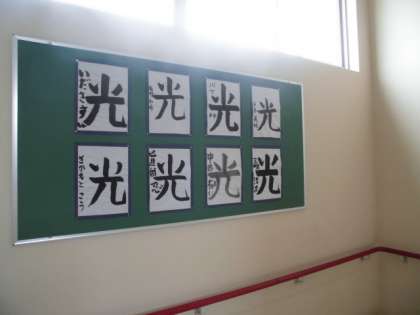 階段踊り場の掲示板に4年生の書写作品が掲示されていました。