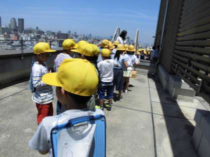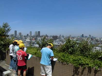 快晴のもと、生野区役所の屋上から東桃谷小学校区を中心に見学しました。