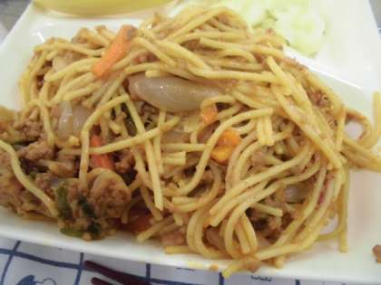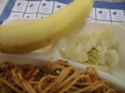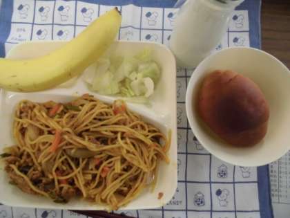 献立は、カレースパゲッティ、キャベツのサラダ、バナナ、パン、牛乳でした。