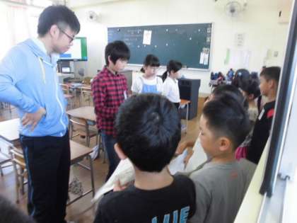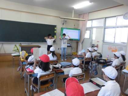 運動会の応援団児童が、各学級に運動会の赤白の応援の仕方について説明、実演をしに行ってました。