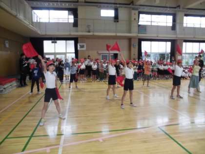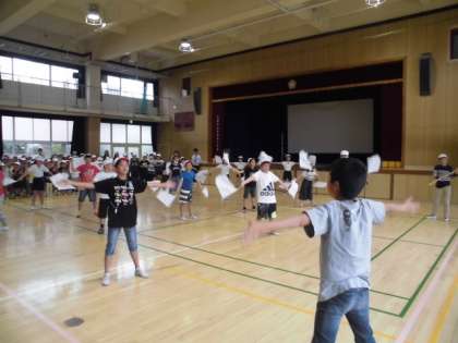 水曜日のひがももタイム(朝の時間)は児童集会ですが、今日は運動会全体練習を講堂で行いました。