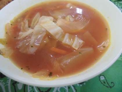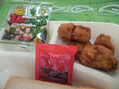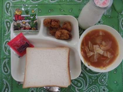 献立は、一口トンカツ、ミネストローネ、豆こんぶ、パン、ジャム、牛乳でした。