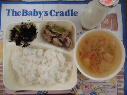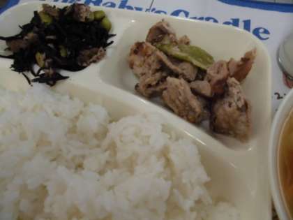 献立は、豚肉のごまだれ焼き、五目汁、ひじきのいため煮、ごはん、牛乳でした。