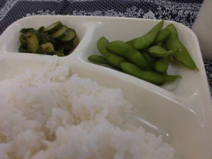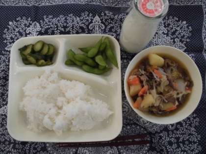 献立は、肉じゃが、きゅうりのかつお梅風味、枝豆、ごはん、牛乳でした。
