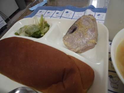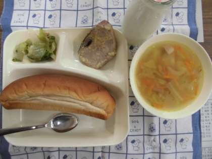 献立は、かつおのガーリックマヨネーズ焼き、スープ、レタスのサラダ、パン、牛乳でした。