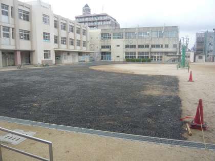 6月2日から運動場の一部芝生化工事が始まっていた土壌改良工事・基礎工事が完了しました。