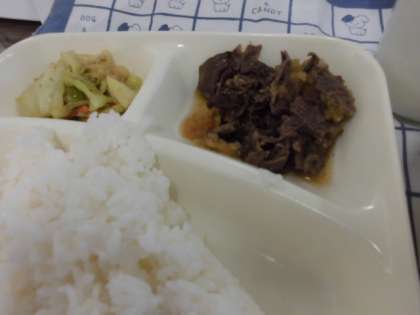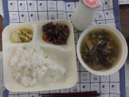 献立は、牛肉のおろしじょうゆかけ、もずくとオクラのとろり汁、野菜のそぼろいため、ごはん、牛乳でした。