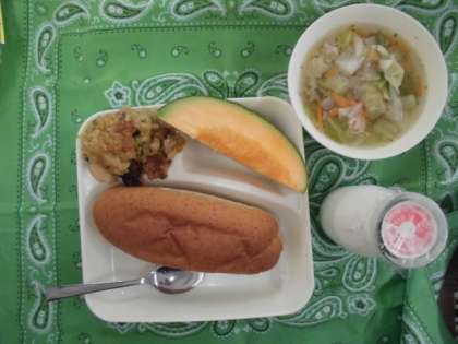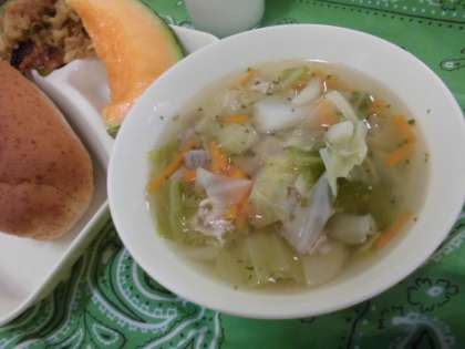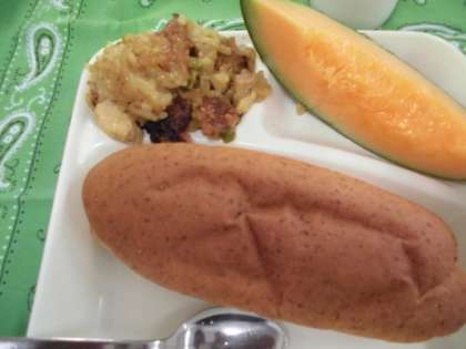 献立は、スープ、カレードリア、クインシーメロン、ライむぎパン、牛乳でした。