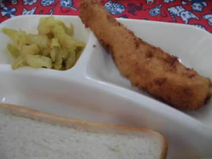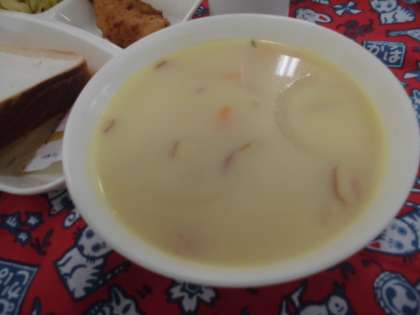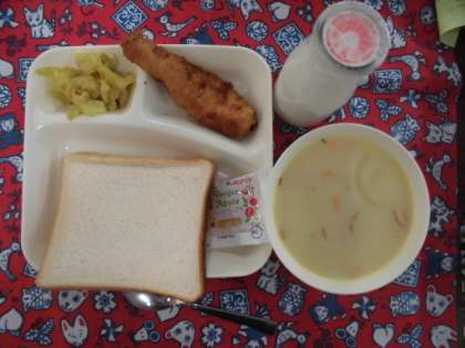 献立は、豆乳コーンスープ、キャベツのカレーソテー、サーモンフライ、りんごジャム、食パン、牛乳でした。